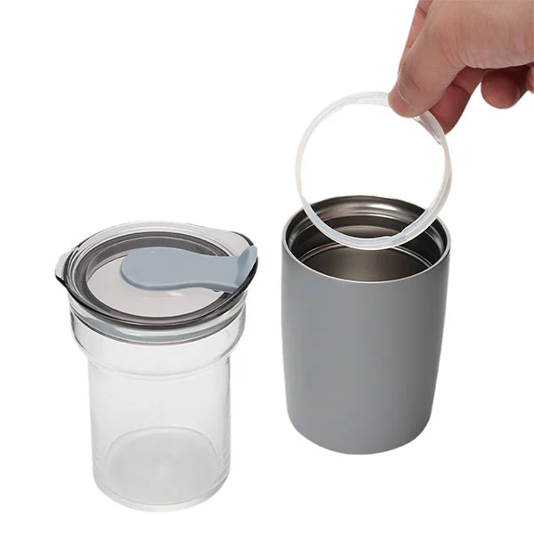 Faoi chomhcheangal an dá choincheap seo, tháinig an tumbler cruach dhosmálta seo le gloine istigh i bhfeidhm.