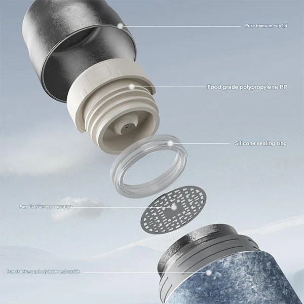 Grúdlann tae clasaiceach, tá buidéal Tíotáiniam ina ghné de chupán cruthúnas sceite déanta as tíotáiniam íon laistigh agus lasmuigh, atá feistithe le cláir sceitedhíonach, caipíní cupán tíotáiniam íon, agus frith-scálú ciseal dúbailte!